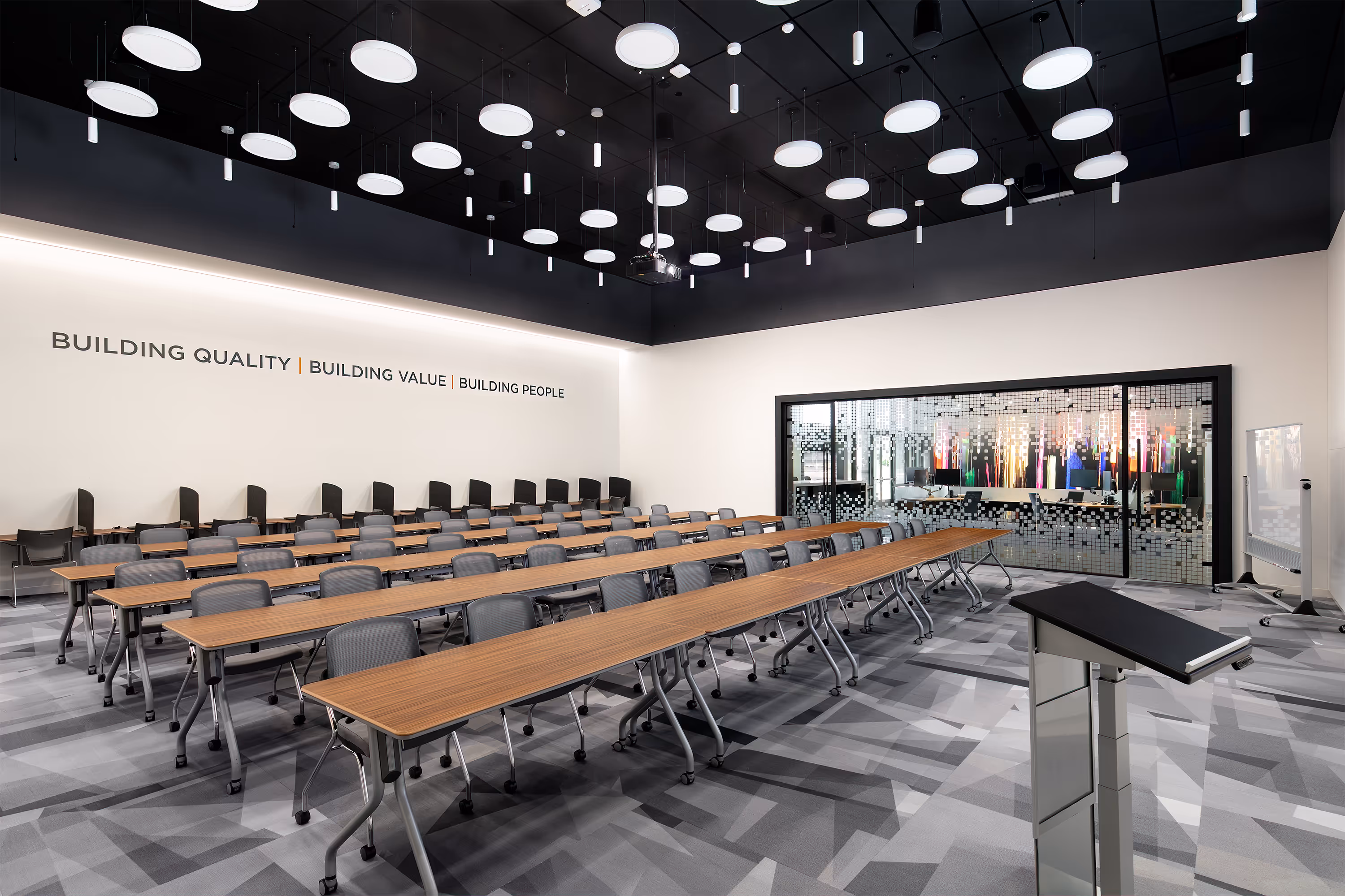 TRINITY Group Construction successfully completed the transformation of a 5,700-square-foot cold warehouse shell into a sleek, industrial class-A amenity space. The space, which serves as a training center and meeting place, includes a new training room, huddle room, open office area, pantry, and contemporary men's and women's restrooms.The project features a striking combination of modern amenities and an exciting array of colors, seamlessly integrated into the adjoining warehouse to create a visually stunning layout.
